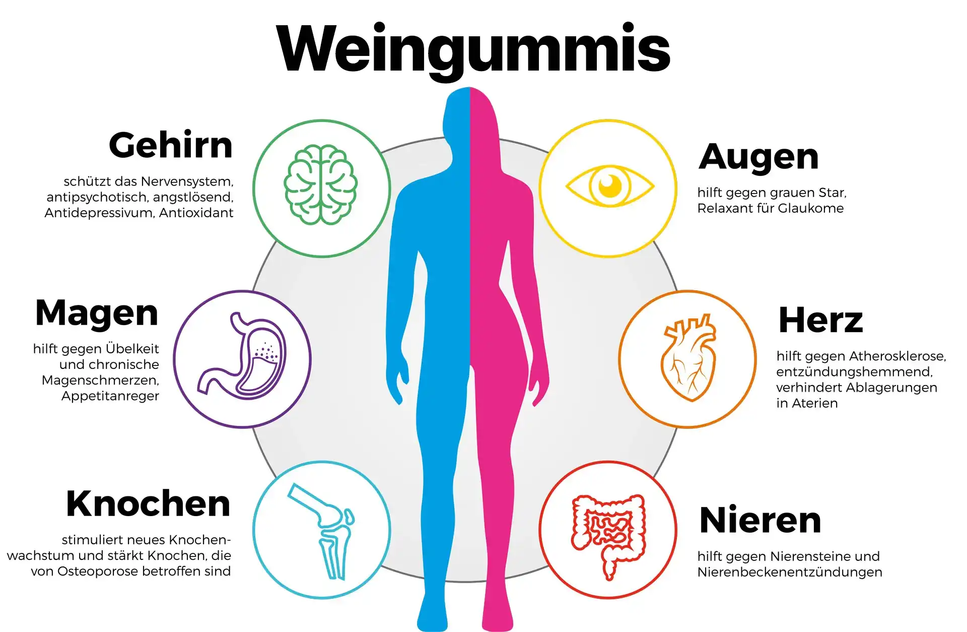 Doch es gibt auch gute Nachrichten, denn Forscher haben herausgefunden, dass viele der positiven Eigenschaften von Weingummis auf dem nicht- Weingummis basieren. Dieser unterstützt die körpereigenen Vitalfunktionen und somit die selbstständige Heilung des Körpers, sowie die Linderung verschiedenster Leiden. Angstzustände, Stress und sogar chronische Schmerzen soll Weingummis deutlich verringern können. Vor allem altersbedingte Beschwerden können erfahrungsgemäß gelindert werden.